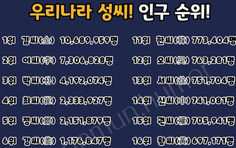 대한민국 성씨별 인구에 대한 정보는 통계청 자료를 기반으로 다양한 출처에서 확인할 수 있습니다. 아래는 주요 성씨별 인구 순위입니다.